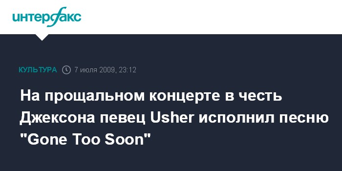 Москва. 7 июля. INTERFAX.RU – На церемонии прощания с Джексоном певец Usher исполнил песню "Gone Too Soon" из альбома Майкла Джексона "Dangerous".