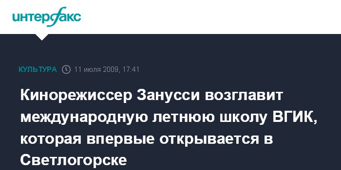 Москва. 11 июля. INTERFAX.RU - В приморском курорте Светлогорск (Калининградская область) впервые открывается Международная летняя кинематографическая школа, которую возглавит выдающийся польский кинорежиссер Кшиштоф Занусси.