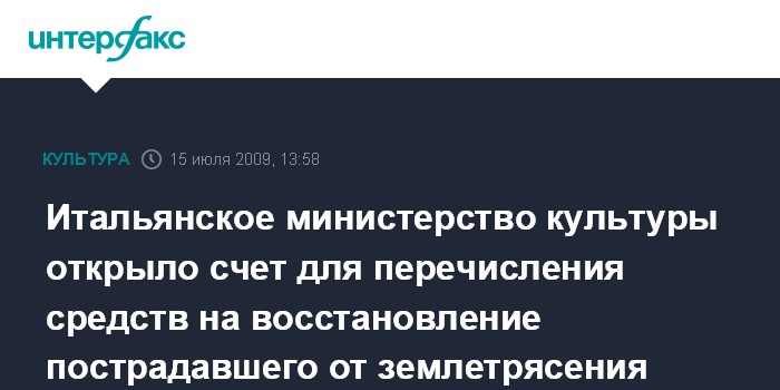 Москва. 15 июля. INTERFAX.RU - Посольство Италии в России информирует, что открыт счет для перечисления денежных средств на восстановление культурного и художественного наследия региона Абруццо, серьезно пострадавшего в результате землетрясения весной этого года.