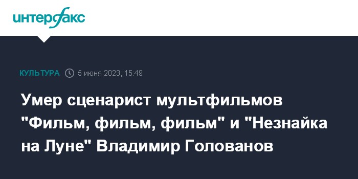 Москва. 5 июня. INTERFAX.RU - Российский писатель, драматург, сценарист, автор сценариев к мультфильмам "Фильм, фильм, фильм", "Горшочек каши", "Незнайка на Луне" Владимир Голованов скончался на 84-м году жизни, сообщил шеф-редактор "Союзмультфильма" Сергей Капков.