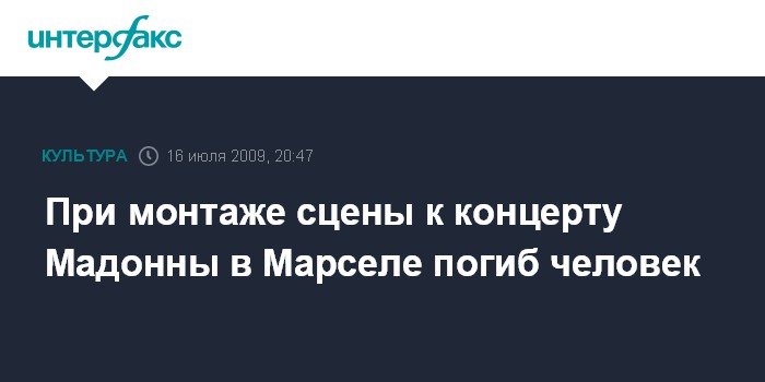 Париж. 16 июля. INTERFAX.RU - Один человек погиб, шестеро получили травмы в четверг в результате обрушения, происшедшего при монтаже сцены к концерту Мадонны на стадионе "Велодром" в Марселе, сообщает интеренет-сайт французской газеты Le Monde.