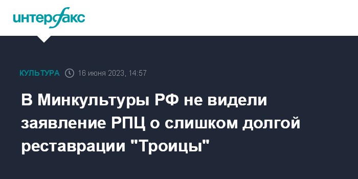 Москва. 16 июня. INTERFAX.RU - Сроки реставрации иконы "Троица" Андрея Рублева зависят от реставраторов, а не от решения чиновников, с заявлением Русской православной церкви в министерстве не ознакомились, заявила министр культуры РФ Ольга Любимова на полях ПМЭФ-2023.