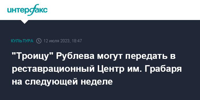 Москва. 12 июля. INTERFAX.RU - Икона "Троица" Андрея Рублева может быть передана в реставрационный центр имени Грабаря на следующей неделе; заседание совета, на котором будут приняты решения по реставрационным мероприятиям, пройдет до конца июля, сообщили "Интерфаксу" в центре.