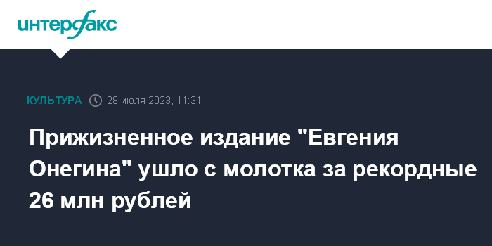"Поставлен новый рекорд по продаже произведений классиков русской литературы: редчайший экземпляр романа "Евгений Онегин", вышедший при жизни Александра Пушкина, продан за 26 млн рублей", - сообщили в пресс-службе аукционного дома.