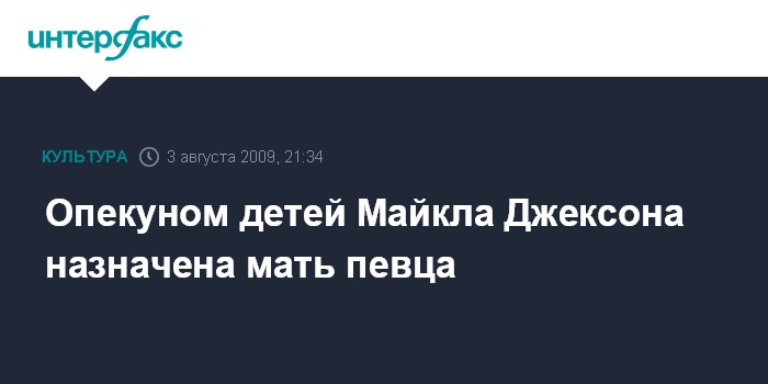 Вашингтон. 3 августа. INTERFAX.RU - Мать покойного американского певца Майкла Джексона Кэтрин Джексона официально признана опекуном троих детей певца, сообщают американские СМИ.