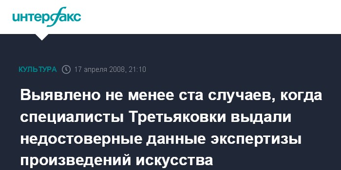 Москва. 17 апреля. ИНТЕРФАКС - Специалисты Третьяковской галереи выдали по крайней мере сто недостоверных результатов экспертизы по произведениям искусства, в том числе оказавшимся впоследствии фальшивыми, сообщил руководитель Федеральной службы по надзору в сфере массовый коммуникаций, связи и охраны культурного наследия (Россвязьохранкультура) Борис Боярсков.
