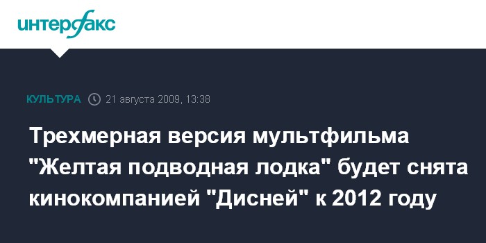 Москва. 21 августа. INTERFAX.RU - Кинокомпания "Дисней" планирует создать трехмерную версию известного мультфильма "Желтая подводная лодка", посвященного группе "Битлз", сообщает в пятницу британская газета "Дейли телеграф".