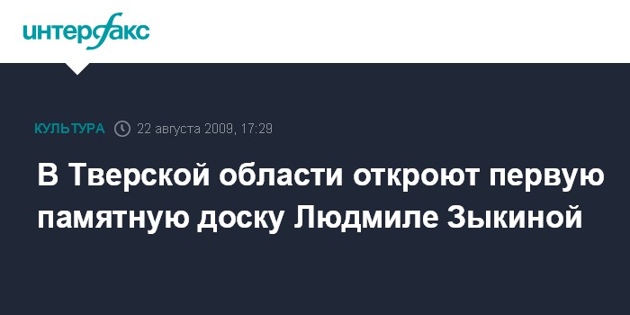 Москва. 22 августа. INTERFAX.RU - Первую памятную доску русской певице Людмиле Зыкиной установят в субботу в селе Кумордино Калининского района Тверской области, сообщили "Интерфаксу" в райадминистрации.