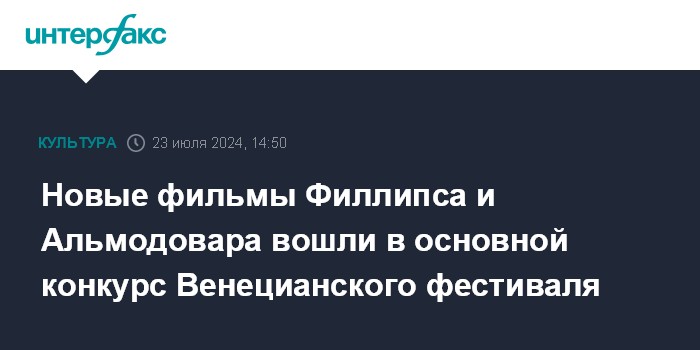 Москва. 23 июля. INTERFAX.RU - В основную программу 81-го Венецианского кинофестиваля вошла 21 картина, среди них новые работы Педро Альмодовара, Тодда Филлипса и Пабло Ларраина, сообщил на пресс-конференции художественный руководитель кинофестиваля Альберто Барбера.