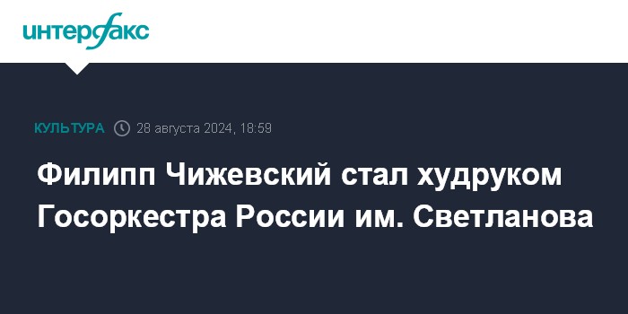 Москва. 28 августа. INTERFAX.RU - Новым художественным руководителем Государственного академического симфонического оркестра России имени Е.Ф.Светланова стал дирижер Филипп Чижевский, сообщила министр культуры РФ Ольга Любимова в своем телеграм-канале.