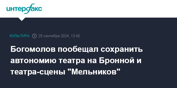 Москва. 25 сентября. INTERFAX.RU - Театр на Бронной и театр-сцена "Мельников" сохранят свою автономию, они останутся двумя разными театрами, с разными репертуарами и командами, заявил на пресс-конференции художественный руководитель обоих театров Константин Богомолов.