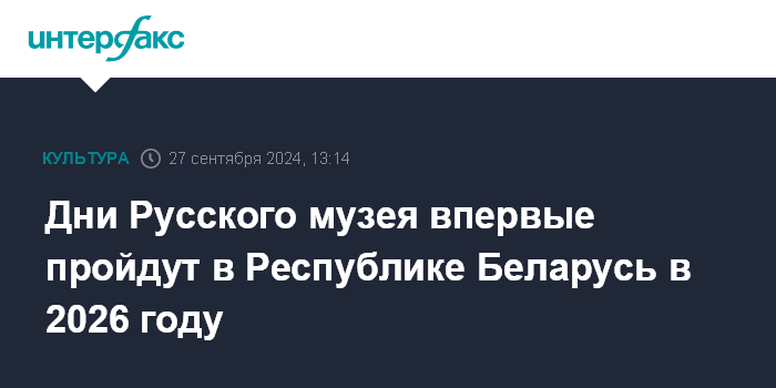 Москва. 27 сентября. INTERFAX.RU - Дни Русского музея пройдут впервые в Белоруссии в 2026 году, их центральным событием станут выставки одного шедевра, который будет отобран генеральным директором Русского музея Аллой Маниловой из числа знаковых работ из сокровищницы музея, сообщили в Минкультуры РФ.