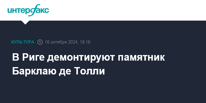Москва. 16 октября. INTERFAX.RU - Рижская дума большинством голосов одобрила демонтаж и перенос из парка в центре города статуи русского полководца Михаила Барклая де Толли, передает агентство Leta.