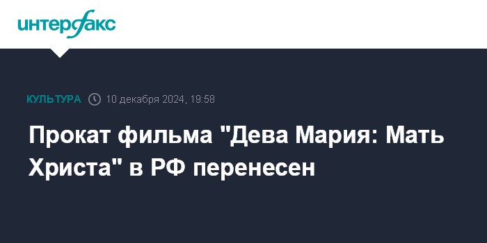 Москва. 10 декабря. INTERFAX.RU - Прокат фильма "Дева Мария: Мать Христа" режиссера Ди Джей Карузо, который должен был стартовать в российских кинотеатрах 12 декабря, перенесен, сообщили представители прокатной компании картины в РФ.