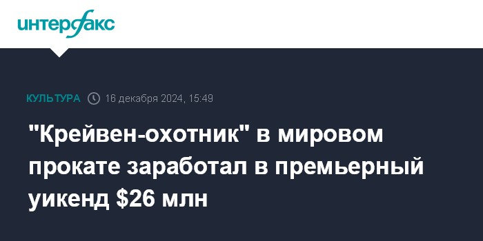 Москва. 16 декабря. INTERFAX.RU - Спинофф саги о Человеке-Пауке "Крейвен-охотник" (Kraven the Hunter) стартовал неудачно, собрав за премьерный уикенд всего $26 млн в мировом прокате, показывают данные Comscore.