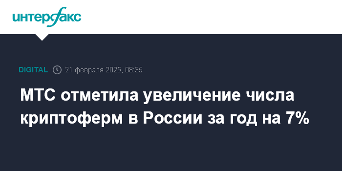 Москва. 21 февраля. INTERFAX.RU - В России с января 2024 года по январь 2025 года число майнинговых ферм увеличилось на 7%, показало исследование ПАО "МТС", проведенное с помощью искусственного интеллекта.