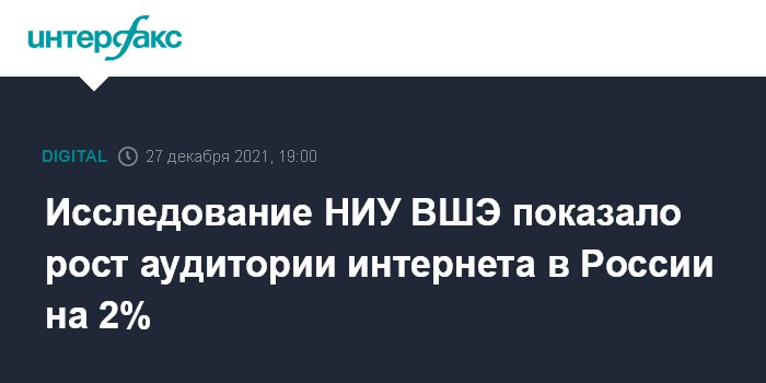 Москва. 27 декабря. INTERFAX.RU - Общая интернет-аудитория страны в 2020 году выросла на 2%, следует из данных аналитического доклада "Тенденции развития интернета: от цифровых возможностей к цифровой реальности", подготовленного Институтом статистических исследований и экономики знаний (ИСИЭЗ) НИУ ВШЭ.