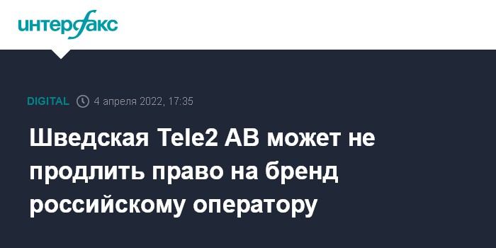 Москва. 4 апреля. INTERFAX.RU - Шведский телекоммуникационный оператор Tele2 AB не будет продлевать истекающее в 2023 году разрешение на использование бренда российскому сотовому оператору Tele2, изучает возможность досрочного прекращения лицензии, пишет издание ComNews со ссылкой на исполнительного вице-президента Tele2 AB Виктора Вальстрема.