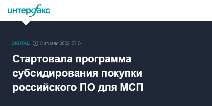 Москва. 8 апреля. INTERFAX.RU - Стартовала программа по субсидированию 50% стоимости покупки отечественного программного обеспечения (ПО) для малого и среднего бизнеса, в этом году объем финансирования программы увеличен вдвое - до 2 млрд рублей, сообщили в пятницу "Интерфаксу" в аппарате вице-премьера Дмитрия Чернышенко.