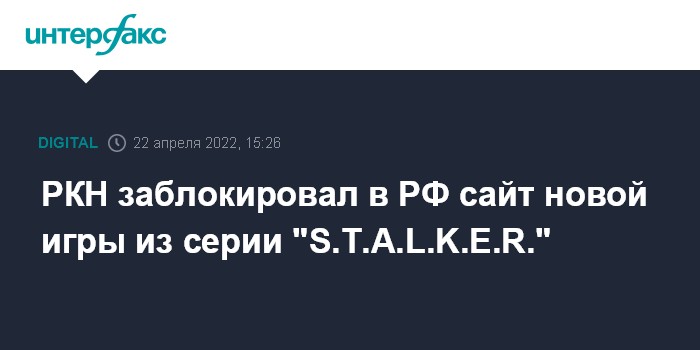 Москва. 22 апреля. INTERFAX.RU - Роскомнадзор (РКН) по требованию Генпрокуратуры заблокировал в РФ доступ к сайту игры "S.T.A.L.K.E.R. 2: Heart of Chornobyl" ("S.T.A.L.K.E.R. 2: Сердце Чернобыля"), выпуск которой намечен на конец 2022 года.