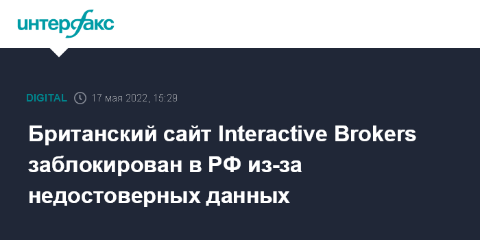 Москва. 17 мая. INTERFAX.RU - Роскомнадзор заблокировал в России доступ к британскому сайту американского брокера Interactive Brokers по требованию Генпрокуратуры из-за недостоверной информации по финансовой тематике, сообщили "Интерфаксу" в ведомстве.