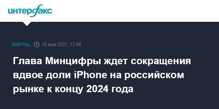 Москва. 18 мая. INTERFAX.RU - Глава Минцифры Максут Шадаев ждет двукратного сокращения доли iPhone на российском рынке до конца 2024 года. Он сообщил об этом на брифинге, ссылаясь на прогноз своего ведомства.