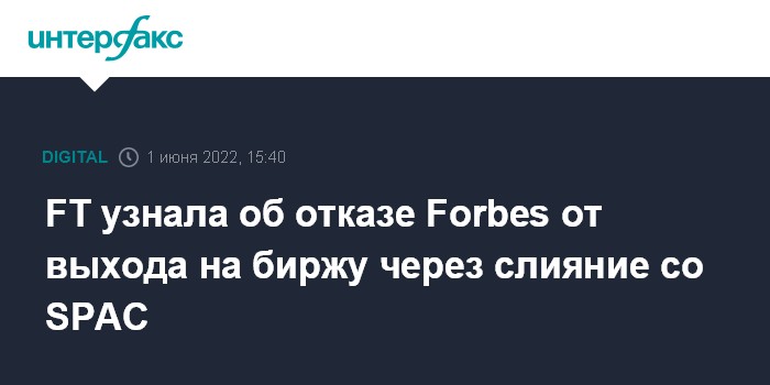 Москва. 1 июня. INTERFAX.RU - Forbes Global Media Holdings Inc. отказалась от планов выхода на открытый рынок через слияние со специализированной компанией по слияниям и поглощениям (SPAC) в связи с ослаблением интереса инвесторов к подобным сделкам, пишет Financial Times со ссылкой на информированные источники.