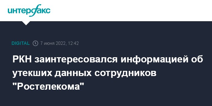 Москва. 7 июня. INTERFAX.RU - Роскомнадзор (РКН) запросил "Ростелеком" о деталях возможной утечки персональных данных сотрудников компании, сообщили "Интерфаксу" в ведомстве.