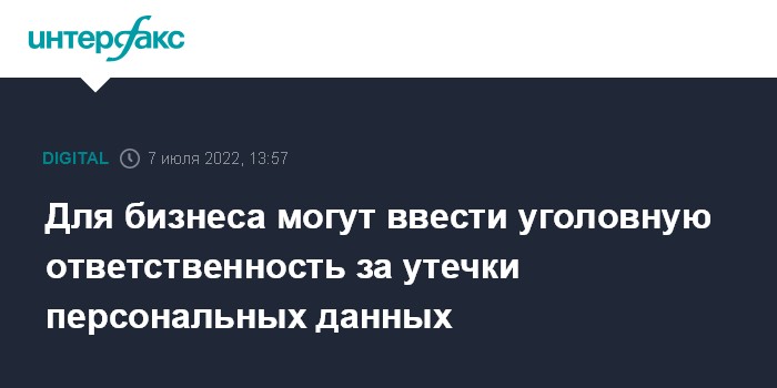 Москва. 7 июля. INTERFAX.RU - Минцифры РФ разрабатывает законопроект, предусматривающий уголовную ответственность для представителей бизнеса за тяжкие последствия утечек персональных данных, сообщил "Интерфаксу" глава комитета Госдумы по информационной политике, информационным технологиям и связи Александр Хинштейн.