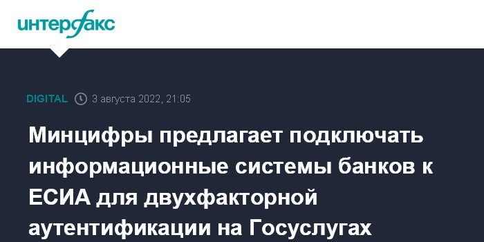 Москва. 3 августа. INTERFAX.RU - Минцифры РФ предлагает подключать информационные системы банков к Единой системе идентификации и аутентификации (ЕСИА) для двухфакторой аутентификации на портале Госуслуг.