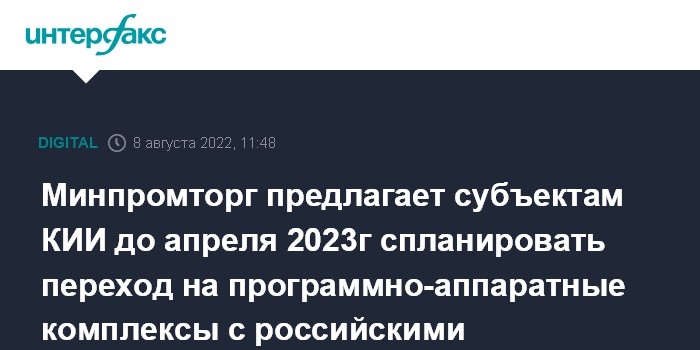 Москва. 8 августа. INTERFAX.RU - Минпромторг РФ разработал порядок перевода объектов критической информационной инфраструктуры (КИИ) на программно-аппаратные комплексы (ПАКи) с отечественными компонентами; проект такого перехода субъекты КИИ должны предоставить в профильную комиссию Совбеза РФ до апреля 2023 года.