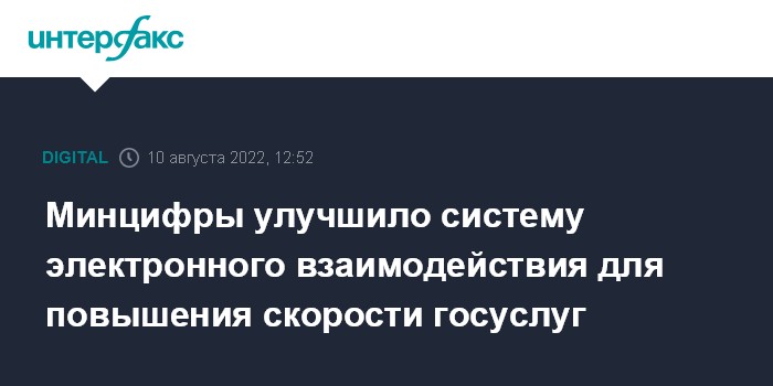 Москва. 10 августа. INTERFAX.RU - Минцифры РФ усовершенствовало систему межведомственного электронного взаимодействия (СМЭВ), благодаря чему повысятся скорость и качество госуслуг, сообщили "Интерфаксу" в пресс-службе ведомства в среду.