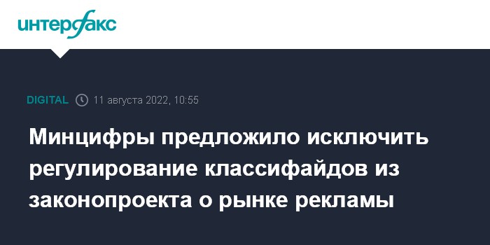 Москва. 11 августа. INTERFAX.RU - Минцифры подготовило поправки к законопроекту о "суверенизации" рынка рекламы, исключающие нормы о регулировании классифайдов, сообщили "Интерфаксу" в пресс-службе ведомства.