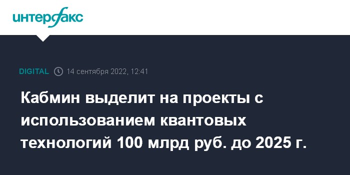Москва. 14 сентября. INTERFAX.RU - Правительство РФ выделит на реализацию соглашений и "дорожной карты" по квантовым вычислениям не менее 100 млрд рублей до 2025 года.