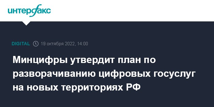 Москва. 19 октября. INTERFAX.RU - Минцифры утвердит в ноябре план-график по обеспечению новых территорий РФ цифровыми сервисами (госуслугами), заявил журналистам глава ведомства Максут Шадаев.