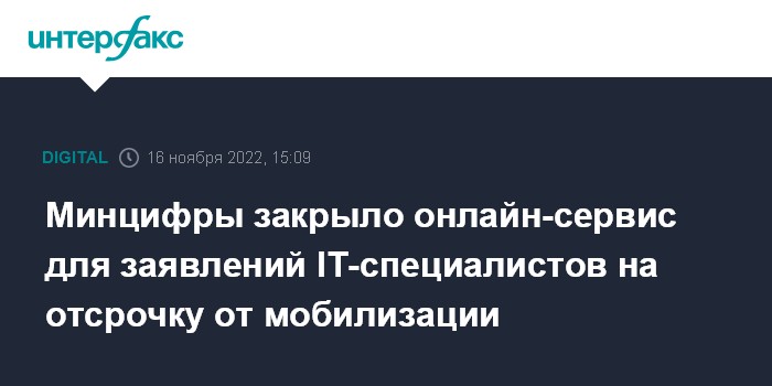 Ранее о планах закрыть сервис 16 ноября сообщил глава ведомства Максут Шадаев, по словам которого около 5 тыс. специалистов, получивших повестки, воспользовались правом на отсрочку, и более 50% обращений поступило в первую неделю с момента запуска сервиса на Госуслугах.