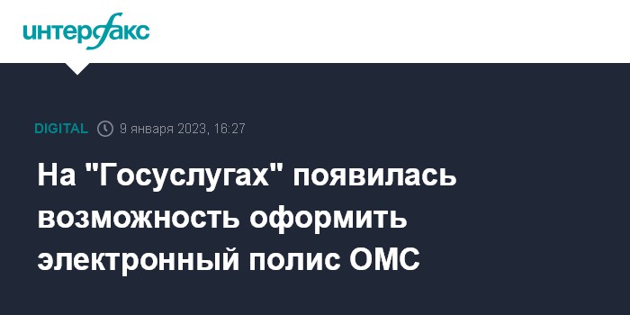 Москва. 9 января. INTERFAX.RU - Минцифры запустило на портале Госуслуг сервис по оформлению электронного полиса обязательного медицинского страхования (ОМС), сообщается в телеграм-канале министерства.