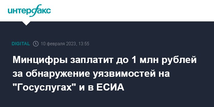 Москва. 10 февраля. INTERFAX.RU - Минцифры объявило, что запустило программу bug bounty (выплата вознаграждения за обнаружение уязвимостей) для поиска "тонких мест" в двух госинформсистемах - на портале Госуслуг и в Единой системе идентификации и аутентификации (ЕСИА).