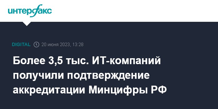 Москва. 20 июня. INTERFAX.RU - Минцифры РФ приняло положительное решение об аккредитации в отношении более 3,5 тыс. ИТ-компаний, сообщил глава министерства Максут Шадаев на CNews FORUM-2023 во вторник.