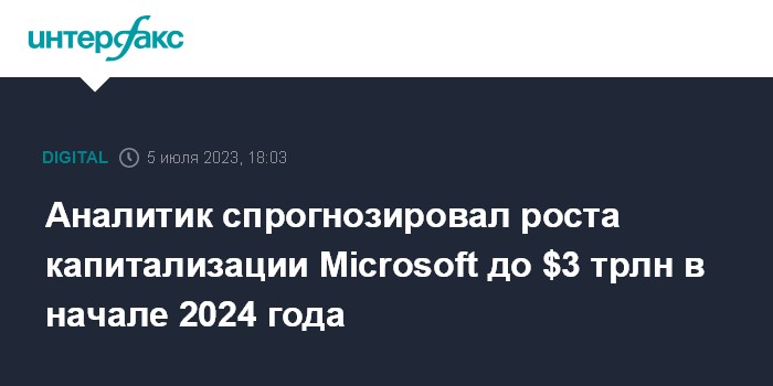 Москва. 5 июля. INTERFAX.RU - Корпорация Microsoft Corp. вслед за Apple Inc. достигнет рыночной стоимости в $3 трлн в начале 2024 года благодаря монетизации технологии искусственного интеллекта, полагает аналитик Wedbush Дэн Айвз.