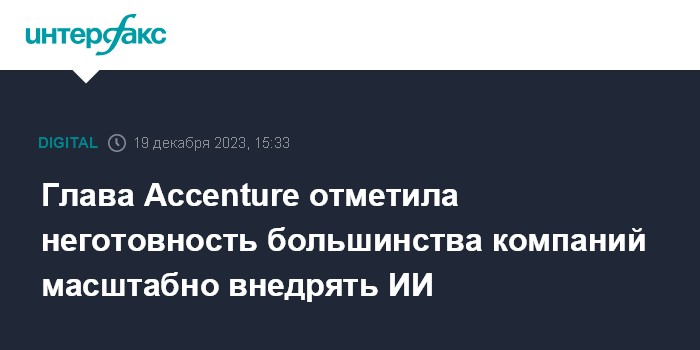 Москва. 19 декабря. INTERFAX.RU - Большинство компаний не готовы масштабно внедрять технологии генеративного (создающего контент и используемого, например, в ChatGPT - ИФ) искусственного интеллекта (ИИ), заявила Financial Times глава консалтинговой фирмы Accenture Джули Свит.