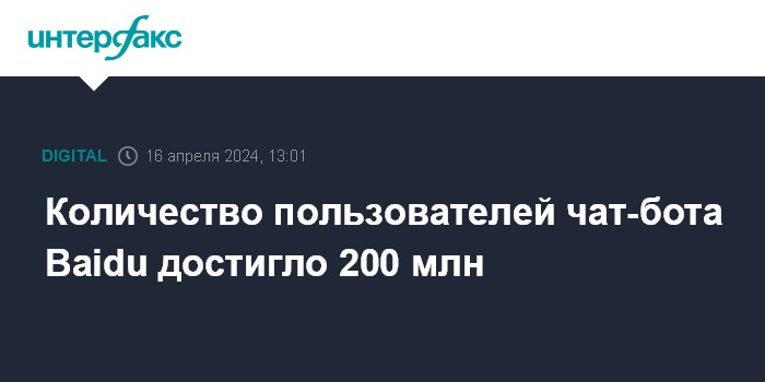 Москва. 16 апреля. INTERFAX.RU - Количество пользователей чат-бота Ernie китайского интернет-гиганта Baidu Inc. удвоилось за последние месяцы и достигло 200 млн.