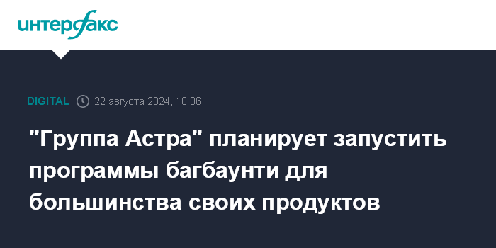 Москва. 22 августа. INTERFAX.RU - ПАО "Группа Астра" (компании группы занимаются разработкой инфраструктурного ПО, включая операционную систему Astra Linux) планирует запустить программы багбаунти (bug bounty - выплата вознаграждения за обнаружение уязвимостей) для большей части продуктов, разрабатываемых компаниями группы/