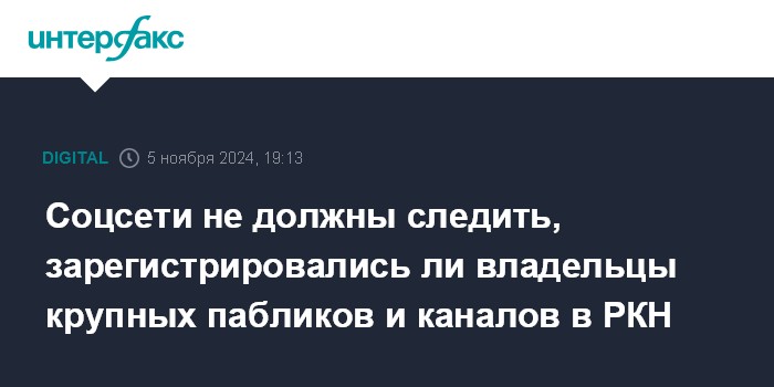 Москва. 5 ноября. INTERFAX.RU - Социальные сети не обязаны следить за исполнением владельцами страниц с аудиторией более 10 тыс. подписчиков закона о деанонимизации; Роскомнадзор после 1 января 2025 года сможет направлять соцсетям требования блокировать страницу или канал нарушителя, сообщает Минцифры.