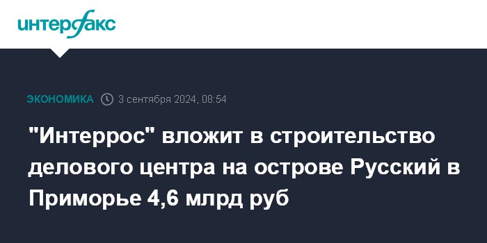 Москва. 3 сентября. INTERFAX.RU - "Интеррос" вложит в строительство делового центра на острове Русский во Владивостоке до 4,6 млрд рублей, соинвестором проекта выступит "ТКС Холдинг", cказал директор департамента проектов в сфере девелопмента и туризма "Интерроса" Александр Сафонов на "полях" IX Восточного экономического форума (ВЭФ) во Владивостоке во вторник.