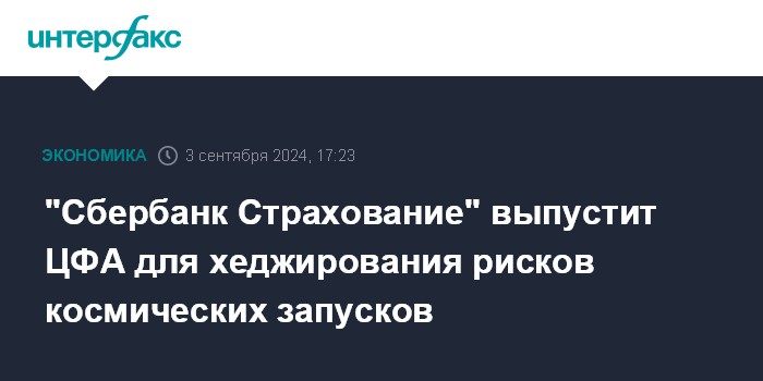 Москва. 3 сентября. INTERFAX.RU - Компания "Сбербанк Страхование" запускает цифровые финансовые активы (ЦФА), хеджирующие риски, связанные с космическими запусками, сообщил страховщик со ссылкой на выступление заместителя председателя правления Сбербанка Анатолия Попова на IX Восточном экономическом форуме (ВЭФ).