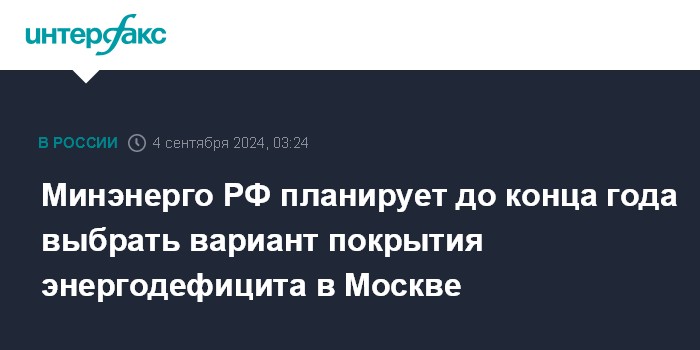 Москва. 4 сентября. INTERFAX.RU - Минэнерго РФ планирует до конца 2024 г. выбрать подходящий вариант покрытия энергодефицита в Москве, рассказал замминистра энергетики Евгений Грабчак журналистам в кулуарах ВЭФ-2024.