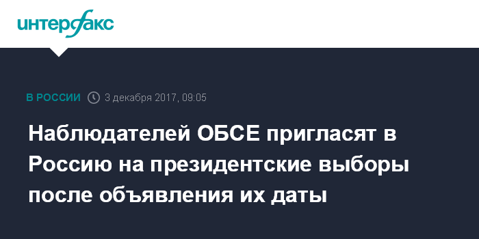 Москва. 3 декабря. INTERFAX.RU - Россия пригласит наблюдателей ОБСЕ на президентские выборы 2018 года сразу после официального назначения их даты, сообщил "Интерфаксу" директор Департамента общеевропейского сотрудничества МИД РФ Андрей Келин.