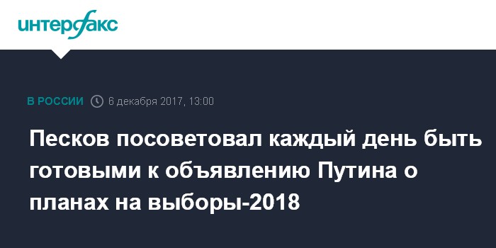 Песков посоветовал каждый день быть готовыми к объявлению Путина о планах на выборы-2018