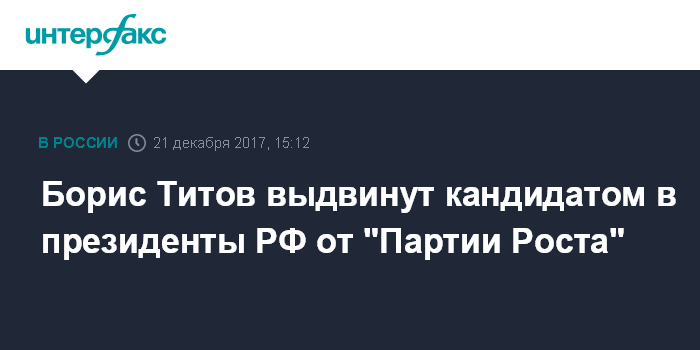 Москва. 21 декабря. INTERFAX.RU - Председатель "Партии Роста" Борис Титов выдвинут кандидатом в президенты России на проходящем в четверг в Москве внеочередном съезде партии.